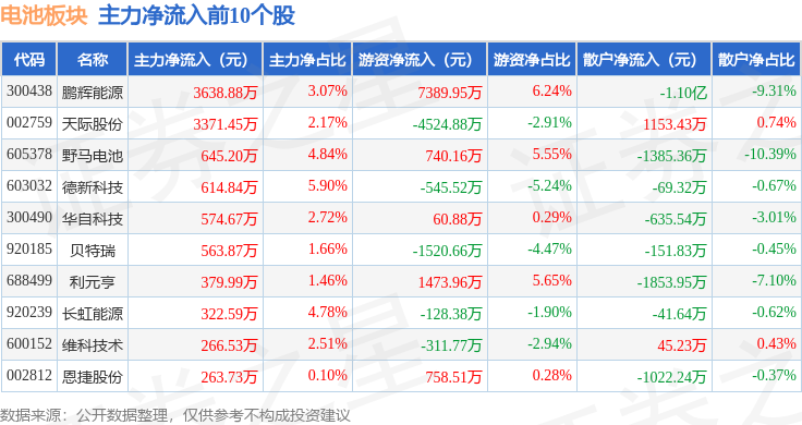 从资金流向上来看,当日电池板块主力资金净流出37.08亿元,游资资金净流出2.31亿元,散户资金净流入39.39亿元。电池板块个股资金流向见下表: