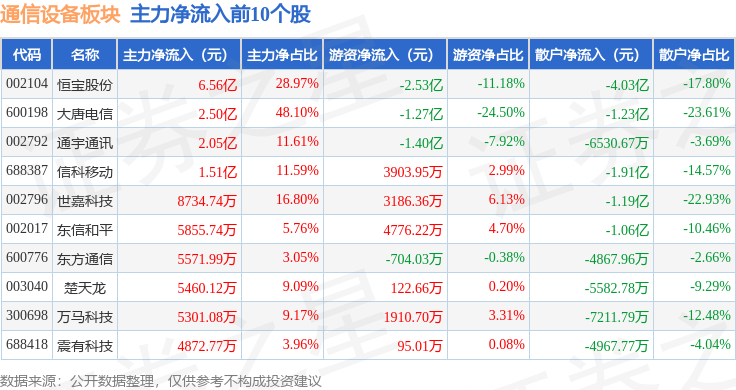 从资金流向上来看,当日通信设备板块主力资金净流出79.39亿元,游资资金净流入36.07亿元,散户资金净流入43.32亿元。通信设备板块个股资金流向见下表: