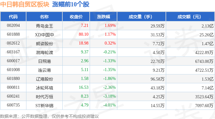 证券之星消息,12月16日中日韩自贸区板块较上一交易日下跌0.06%,青岛双星领跌。当日上证指数报收于3824.81,下跌1.11%。深证成指报收于12914.67,下跌1.51%。中日韩自贸区板块个股涨跌见下表: