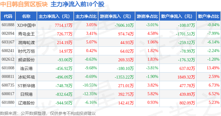 从资金流向上来看,当日中日韩自贸区板块主力资金净流入2923.88万元,游资资金净流出7838.67万元,散户资金净流入4914.78万元。中日韩自贸区板块个股资金流向见下表: