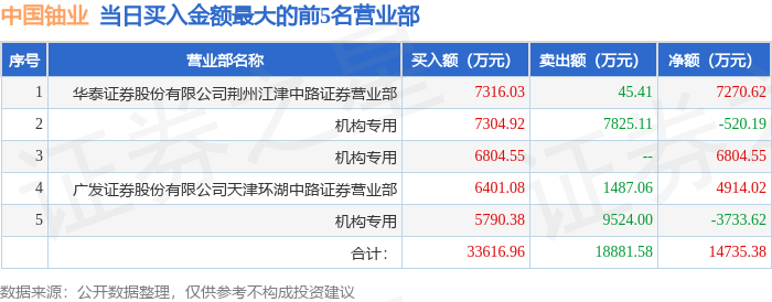 证券之星消息,沪深交易所2025年12月16日公布的交易公开信息显示,中国铀业(001280)因日跌幅偏离值达到7%的前5只证券,日换手率达到20%的前5只证券登上龙虎榜。此次是近5个交易日内第4次上榜。