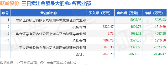 证券之星消息,沪深交易所2025年12月16日公布的交易公开信息显示,跃岭股份(002725)因连续三个交易日内,跌幅偏离值累计达到20%的证券登上龙虎榜。此次是近5个交易日内第4次上榜。