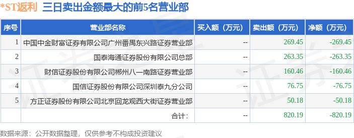 证券之星消息,沪深交易所2025年12月16日公布的交易公开信息显示,*ST返利(600228)因ST、*ST证券连续三个交易日内收盘价格跌幅偏离值累计达到12%的证券登上龙虎榜。此次是近5个交易日内第2次上榜。