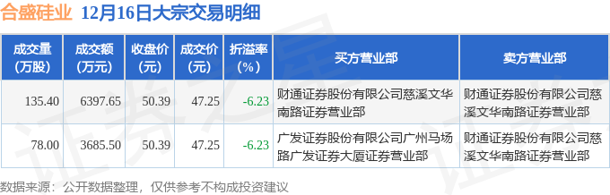 证券之星消息,12月16日合盛硅业发生大宗交易,交易数据如下: