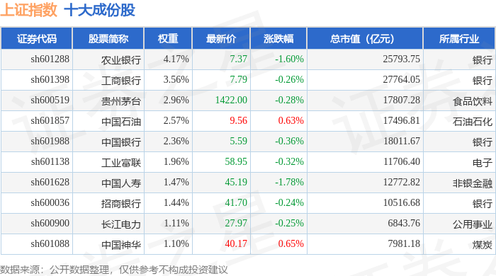 上证指数(000001)十大成份股详情如下: