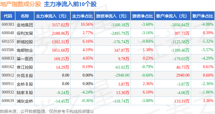 资金流向方面,地产指数(000006)成份股当日主力资金净流出合计1.33亿元,游资资金净流出合计613.52万元,散户资金净流入合计1.39亿元。成份股资金流向详情见下表: