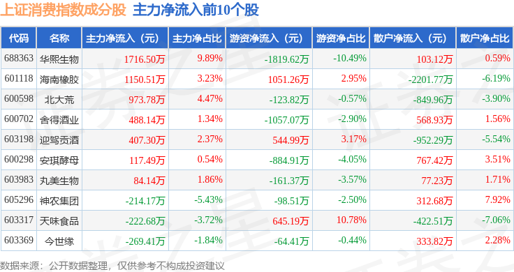 资金流向方面,上证消费(000036)指数成份股当日主力资金净流出合计4.16亿元,游资资金净流入合计2.38亿元,散户资金净流入合计1.78亿元。成份股资金流向详情见下表: