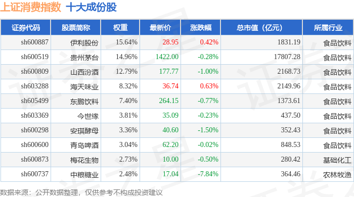 证券之星消息,12月16日,上证消费(000036)指数报收于10899.61点,跌0.47%,成交119.85亿元,换手率0.85%。当日该指数成份股中,上涨的有8家,安井食品以1.57%的涨幅领涨,下跌的有22家,中粮糖业以7.84%的跌幅领跌。