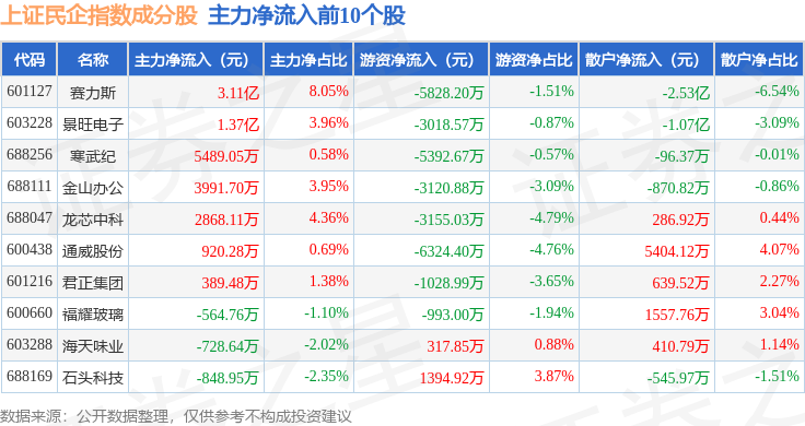 资金流向方面,上证民企(000049)指数成份股当日主力资金净流出合计61.62亿元,游资资金净流入合计6.73亿元,散户资金净流入合计54.88亿元。成份股资金流向详情见下表: