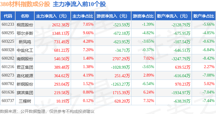资金流向方面,380材料(000105)指数成份股当日主力资金净流出合计15.37亿元,游资资金净流入合计5.25亿元,散户资金净流入合计10.12亿元。成份股资金流向详情见下表: