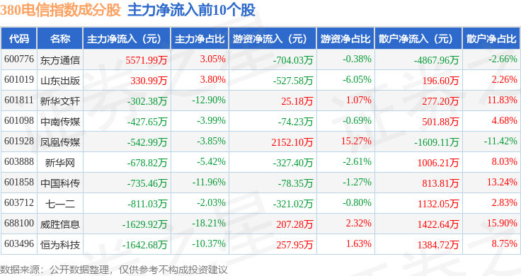 资金流向方面,380电信(000112)指数成份股当日主力资金净流出合计18.01亿元,游资资金净流入合计6.74亿元,散户资金净流入合计11.27亿元。成份股资金流向详情见下表: