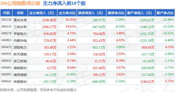 资金流向方面,380公用(000113)指数成份股当日主力资金净流出合计5.73亿元,游资资金净流入合计8265.96万元,散户资金净流入合计4.9亿元。成份股资金流向详情见下表: