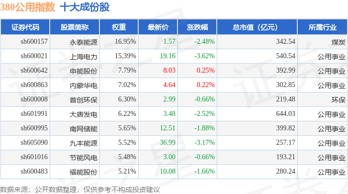 证券之星消息,12月16日,380公用(000113)指数报收于2935.39点,跌1.69%,成交56.02亿元,换手率1.28%。当日该指数成份股中,上涨的有3家,三峡水利以1.41%的涨幅领涨,下跌的有15家,上海电力以3.62%的跌幅领跌。