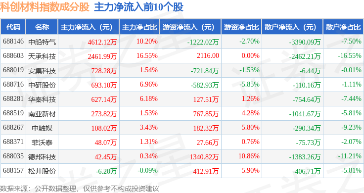 资金流向方面,科创材料(000689)指数成份股当日主力资金净流出合计10.48亿元,游资资金净流入合计5.41亿元,散户资金净流入合计5.07亿元。成份股资金流向详情见下表:
