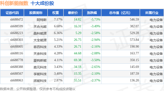 证券之星消息,12月16日,科创新能(000692)指数报收于1085.38点,跌3.06%,成交106.96亿元,换手率1.55%。当日该指数成份股中,下跌的有42家,天宜新材以5.95%的跌幅领跌。
