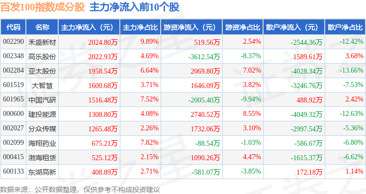 资金流向方面,百发100(000851)指数成份股当日主力资金净流出合计26.79亿元,游资资金净流入合计3.67亿元,散户资金净流入合计23.12亿元。成份股资金流向详情见下表: