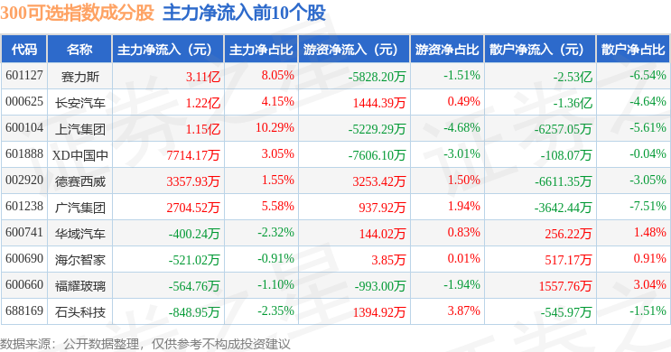 资金流向方面,300可选(000911)指数成份股当日主力资金净流出合计5853.97万元,游资资金净流入合计6305.5万元,散户资金净流出合计451.53万元。成份股资金流向详情见下表: