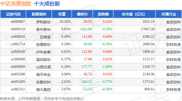 中证消费(000932)指数十大成份股详情如下: