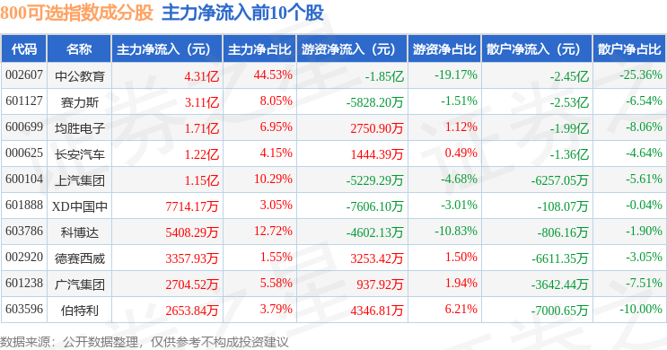 资金流向方面,800可选(000931)指数成份股当日主力资金净流出合计2.0亿元,游资资金净流出合计1.6亿元,散户资金净流入合计3.6亿元。成份股资金流向详情见下表: