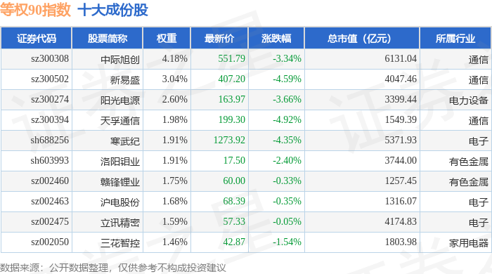 等权90(000971)指数十大成份股详情如下: