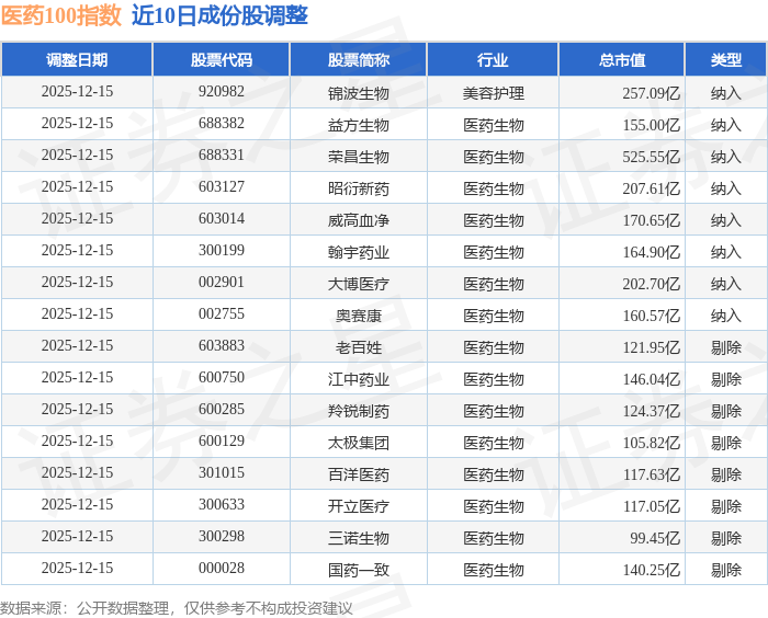 近10日内医药100(000978)指数成份股做了调整,新纳入了8只股票,剔除了8只股票。