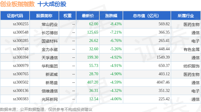 证券之星消息,12月16日,创业板指(399006)指数报收于3071.76点,跌2.1%,成交4533.47亿元,换手率3.51%。当日该指数成份股中,上涨的有26家,卓胜微以4.62%的涨幅领涨,下跌的有73家,常山药业以8.43%的跌幅领跌。