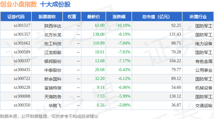 证券之星消息,12月16日,创业小盘(399020)指数报收于1676.17点,跌1.5%,成交815.3亿元,换手率4.44%。当日该指数成份股中,上涨的有58家,万集科技以20.02%的涨幅领涨,下跌的有239家,陕西华达以10.1%的跌幅领跌。