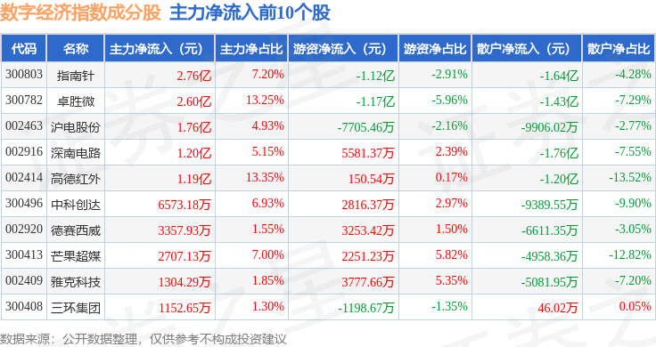 资金流向方面,数字经济(399262)指数成份股当日主力资金净流出合计75.68亿元,游资资金净流入合计38.05亿元,散户资金净流入合计37.63亿元。成份股资金流向详情见下表:
