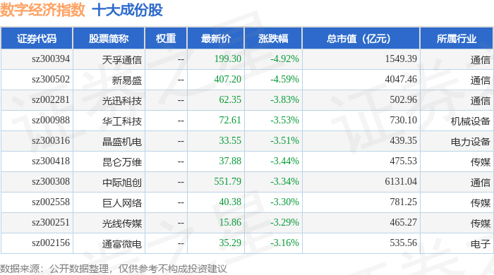 证券之星消息,12月16日,数字经济(399262)指数报收于2708.65点,跌2.2%,成交1063.02亿元,换手率1.86%。当日该指数成份股中,上涨的有9家,卓胜微以4.62%的涨幅领涨,下跌的有41家,天孚通信以4.92%的跌幅领跌。