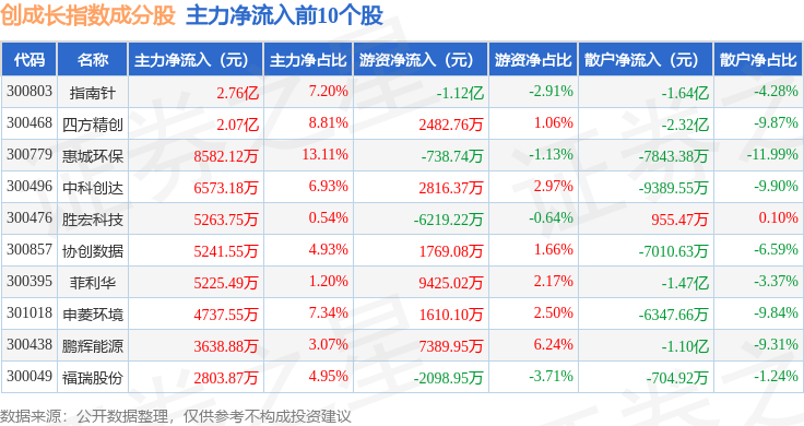 资金流向方面,创成长(399296)指数成份股当日主力资金净流出合计101.39亿元,游资资金净流入合计38.34亿元,散户资金净流入合计63.06亿元。成份股资金流向详情见下表: