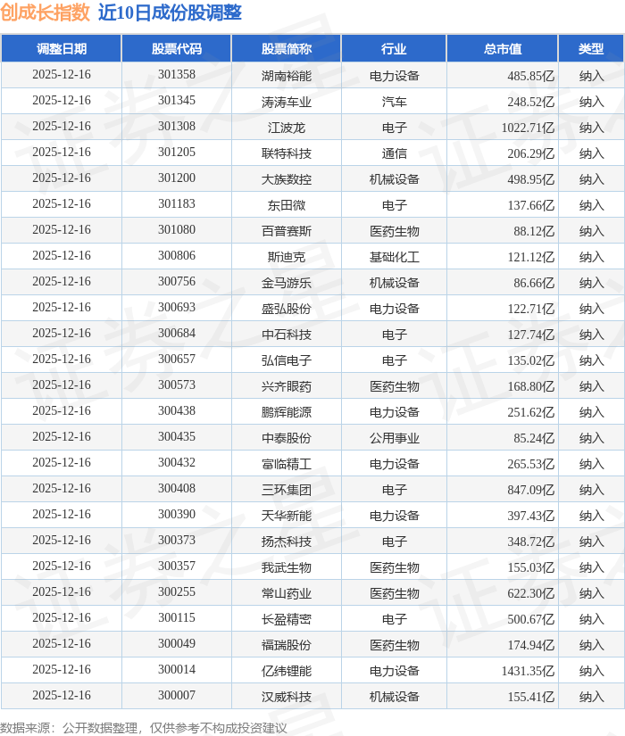 近10日内创成长(399296)指数成份股做了调整,新纳入了25只股票。