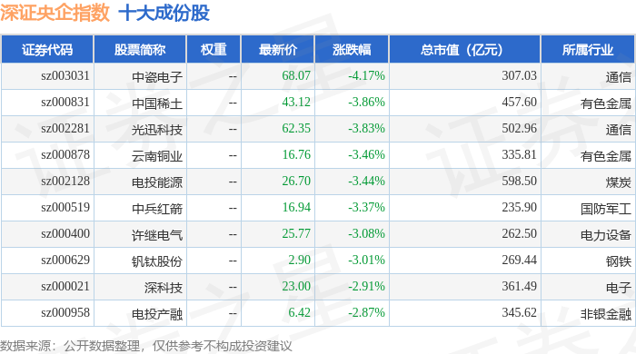 深证央企(399335)指数十大成份股详情如下: