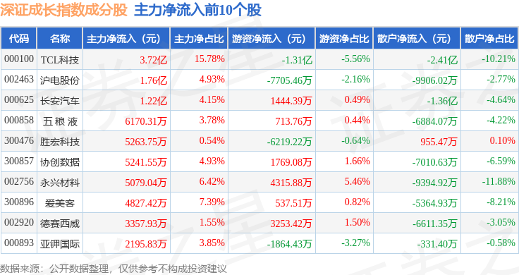 资金流向方面,深证成长(399346)指数成份股当日主力资金净流出合计112.11亿元,游资资金净流入合计38.48亿元,散户资金净流入合计73.63亿元。成份股资金流向详情见下表: