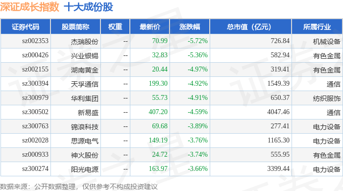 深证成长(399346)指数十大成份股详情如下:
