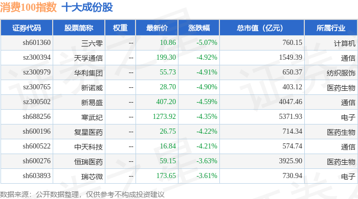 消费100(399364)指数十大成份股详情如下: