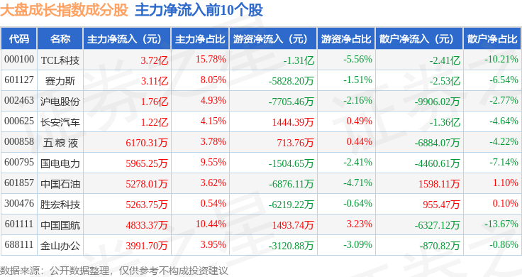 资金流向方面,大盘成长(399372)指数成份股当日主力资金净流出合计92.8亿元,游资资金净流入合计43.35亿元,散户资金净流入合计49.45亿元。成份股资金流向详情见下表: