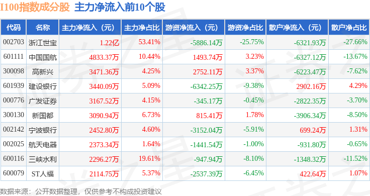 资金流向方面,I100(399415)指数成份股当日主力资金净流出合计24.09亿元,游资资金净流入合计3.48亿元,散户资金净流入合计20.6亿元。成份股资金流向详情见下表: