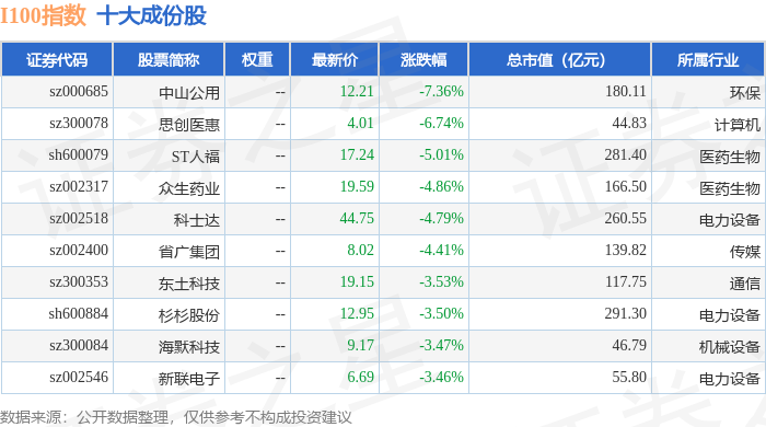 证券之星消息,12月16日,I100(399415)指数报收于6809.75点,跌1.75%,成交909.25亿元,换手率0.44%。当日该指数成份股中,上涨的有16家,浙江世宝以10.04%的涨幅领涨,下跌的有76家,中山公用以7.36%的跌幅领跌。