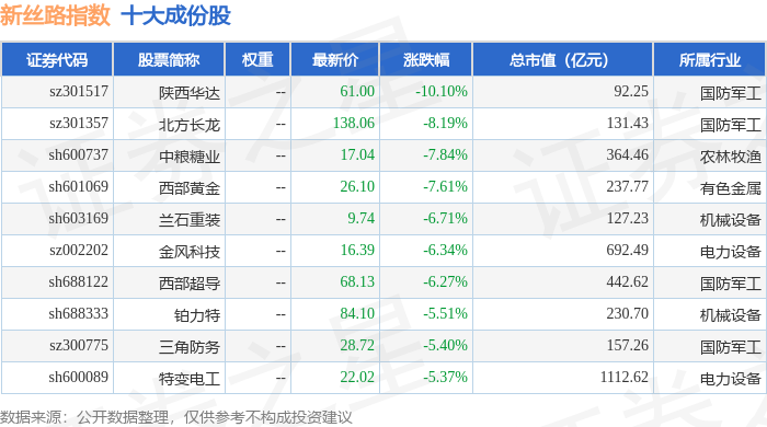 新丝路(399429)指数十大成份股详情如下: