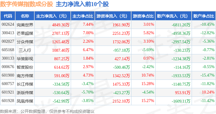 资金流向方面,数字传媒(399434)指数成份股当日主力资金净流出合计24.65亿元,游资资金净流入合计4.97亿元,散户资金净流入合计19.67亿元。成份股资金流向详情见下表: