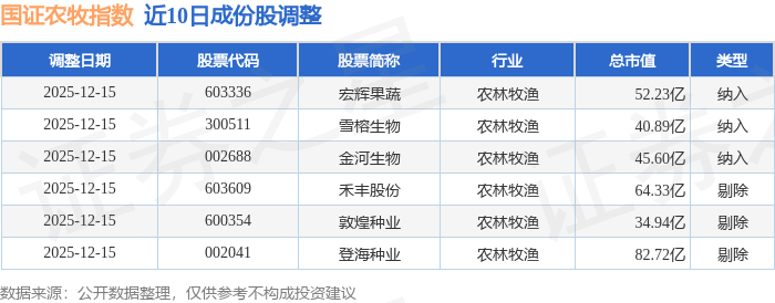 近10日内国证农牧(399435)指数成份股做了调整,新纳入了3只股票,剔除了3只股票。