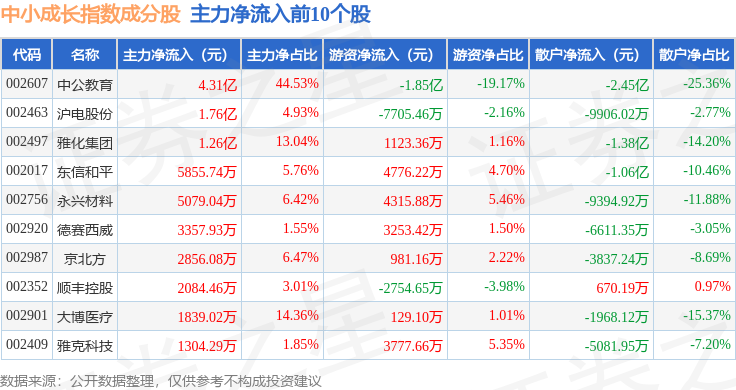 资金流向方面,中小成长(399602)指数成份股当日主力资金净流出合计39.15亿元,游资资金净流入合计3.17亿元,散户资金净流入合计35.98亿元。成份股资金流向详情见下表: