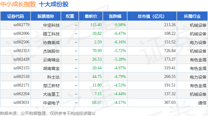证券之星消息,12月16日,中小成长(399602)指数报收于1227.58点,跌1.22%,成交784.28亿元,换手率2.05%。当日该指数成份股中,上涨的有20家,中公教育以9.92%的涨幅领涨,下跌的有80家,中坚科技以9.98%的跌幅领跌。