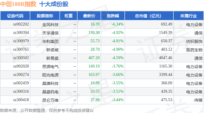 证券之星消息,12月16日,中创100R(399611)指数报收于3127.95点,跌1.71%,成交1693.63亿元,换手率1.09%。当日该指数成份股中,上涨的有20家,卓胜微以4.62%的涨幅领涨,下跌的有79家,金风科技以6.34%的跌幅领跌。