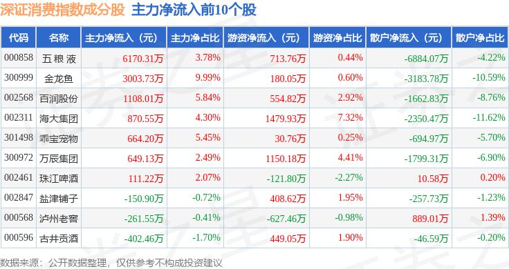 资金流向方面,深证消费(399617)指数成份股当日主力资金净流出合计2.03亿元,游资资金净流入合计7339.79万元,散户资金净流入合计1.3亿元。成份股资金流向详情见下表: