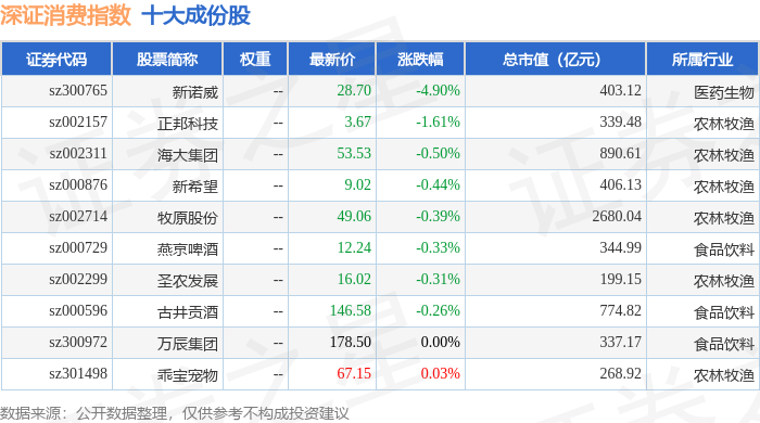 证券之星消息,12月16日,深证消费(399617)指数报收于9377.55点,跌0.03%,成交84.58亿元,换手率1.5%。当日该指数成份股中,上涨的有11家,百润股份以2.73%的涨幅领涨,下跌的有8家,新诺威以4.9%的跌幅领跌。