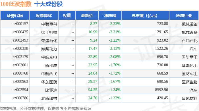 100低波(399645)指数十大成份股详情如下: