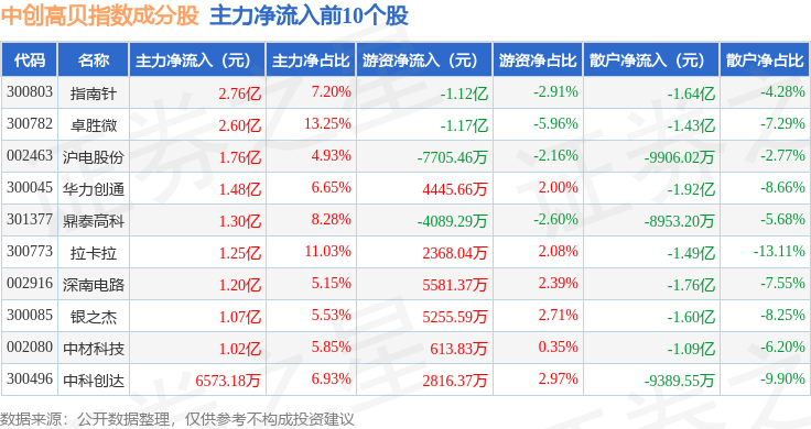 资金流向方面,中创高贝(399666)指数成份股当日主力资金净流出合计178.72亿元,游资资金净流入合计51.18亿元,散户资金净流入合计127.53亿元。成份股资金流向详情见下表: