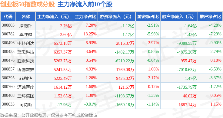 资金流向方面,创业板50(399673)指数成份股当日主力资金净流出合计101.81亿元,游资资金净流入合计38.73亿元,散户资金净流入合计63.08亿元。成份股资金流向详情见下表: