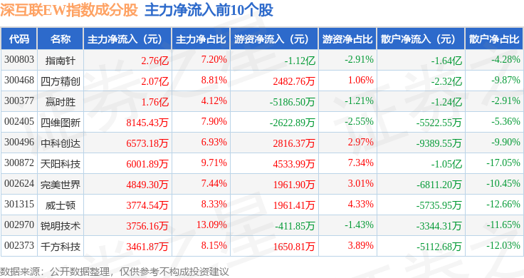 资金流向方面,深互联EW(399677)指数成份股当日主力资金净流出合计18.23亿元,游资资金净流入合计3.45亿元,散户资金净流入合计14.78亿元。成份股资金流向详情见下表: